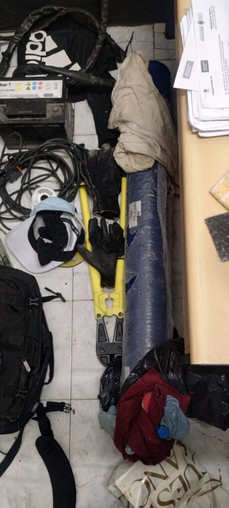 Durante el procedimiento se incautaron herramientas y equipamiento como herramientas de corte, sogas, mochilas, pasamontañas y guantes, una amoladora, cortadoras de candados, una batería de auto, cinco celulares, un inhibidor de señal, dos handys, un tubo de oxígeno con manguera de corte de plasma. También un vehículo Ford Fiesta gris con cristales grabados con otro dominio sobre el cual pesaba un pedido de secuestro activo por hurto en CABA.